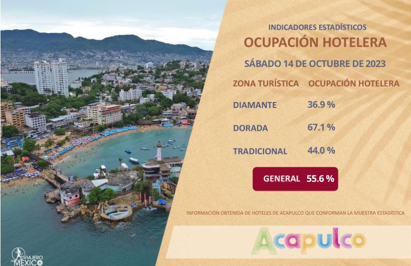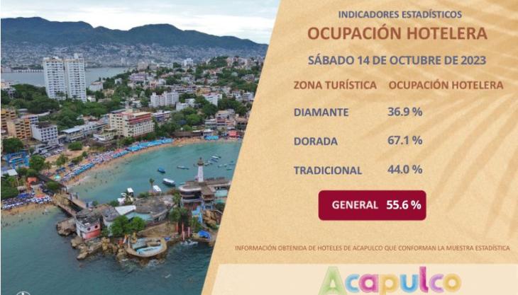 Acapulco, Gro., 14 de octubre de 2023.– El Gobierno Municipal que preside Abelina López Rodríguez, a través de la Secretaría de Turismo Municipal informa que este sábado se registra una ocupación hotelera promedio general del 55.6 por ciento.