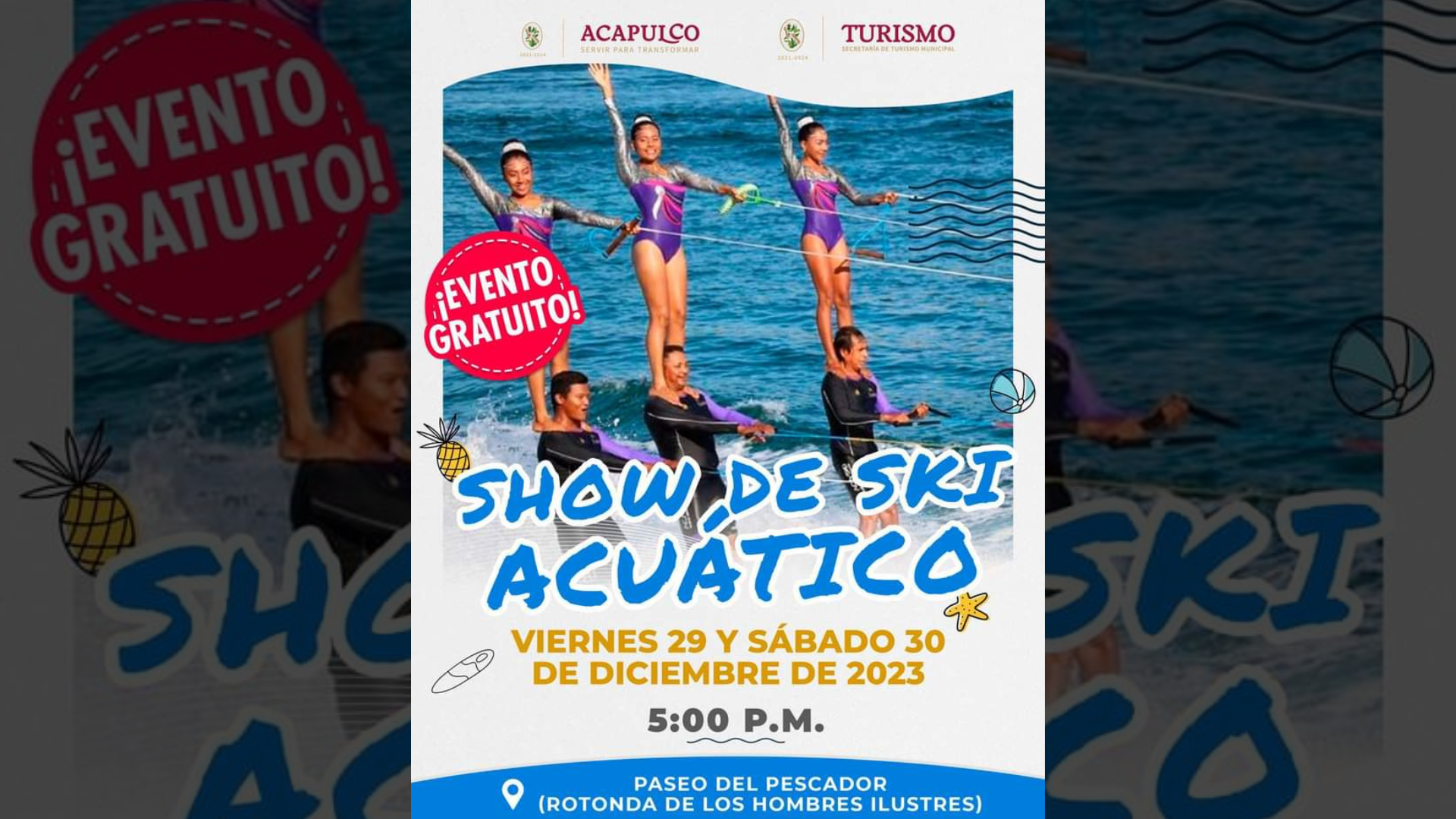 La Academia de esquí Acuático Nueva Generación, tendrá presentaciones gratuitas este viernes 29 de diciembre y este sábado 30 de diciembre del 2023, están citando a las 5 de la tarde en el paseo del pescador (Rotonda de los hombres ilustres).
